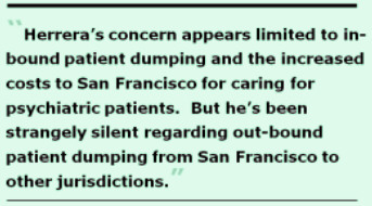 Herreras concern appears limited to in-bound patient dumping and the increased costs to San Francisco for caring for psychiatric patients. But Herrera has been strangely silent regarding out-bound patient dumping from San Francisco to other jurisdictions, and potential patient dumping between San Francisco facilities. His hypocrisy is breathtaking.