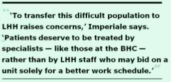 Many of LHHs department heads are concerned about DPHs decision to reconfigure the MHRF/BHC and place the 34 BHC patients into LHH. But they remember that when former LHH Executive Administrator Larry Funk opposed admission of violent patients to LHH, he was replaced and demoted.