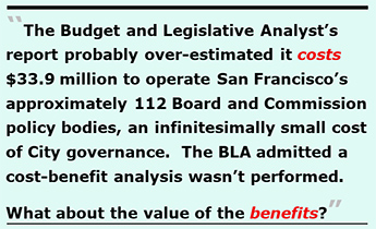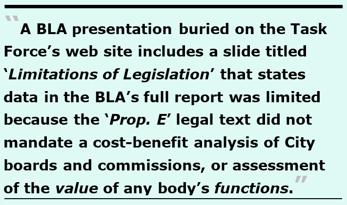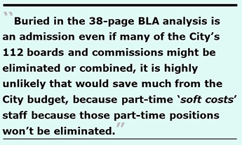 Buried in the 38-page BLA analysis is an admission that even assuming many of the City’s 112 boards and commissions might be eliminated or combined, it is highly unlikely that would save much of anything from the City budget, precisely because the $22.6 million for part-time “soft costs” staff who perform other job duties and only contribute small fractions of their time supporting boards and commissions, won’t be eliminated from the City’s payroll, even if their governing board and commission is, in fact, eliminated. The BLA reported: “Such positions are not likely to be deleted in the event of a board or commission elimination and thus would not represent hard savings for the City.”