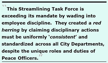 This Streamlining Task Force is exceeding its mandate by wading into employee discipline. They created a red herring by claiming disciplinary actions must be uniformly “consistent” and standardized across all City Departments, despite the unique roles and duties of Peace Officers. The Task Force should preserve police officers’ rights to a hearing on disciplinary matters before an Administrative Law Judge, and not hand all disciplinary matters to the Chief of Police — which would create a situation in which the police are allowed to police themselves. Clearly, Police Commission members are not trained in human resources processes, or in laws regarding employee discipline and employee due-process rights.