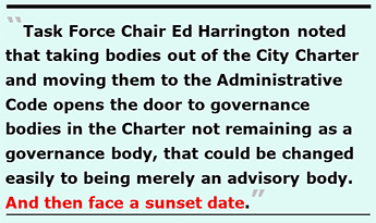 Even Streamlining Task Force Chair Ed Harrington cautioned the other four Task Force members on June 4 against “dramatically altering the city’s commission structure.”“Prop. E” was about streamlining, not radically overhauling, public governance. Absent a cost-benefit assessment of boards and commissions functions and value, the Task Force may radically overhaul our public governance, that Chair Harrington cautioned against doing!
