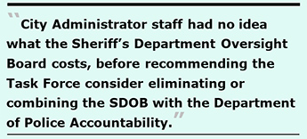 City Administrator staff supporting the Task Force had no idea what the “Sheriff’s Department Oversight Board” (SDOB) costs, before making its recommendation the Streamlining Task Force consider eliminating the SDOB, or combining it with the Department of Police Accountability under the Police Commission, based on the false premise of “efficiency.”
