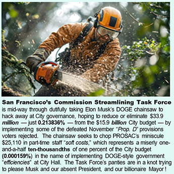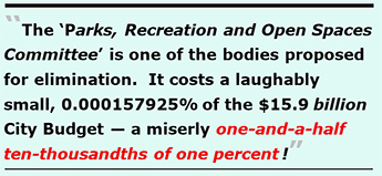 The “Parks, Recreation and Open Spaces Committee” (PROSAC) is one of the bodies proposed for elimination that will be debated. The BLA report acknowledges PROSAC costs just $25,110 annually — all of which are “soft costs” of part-time Park Department staff who will still keep their jobs performing other duties, which won’t save the City another red cent. That’s a laughably small, 0.000157925% of the $15.9 billion City Budget — a miserly one-and-a-half ten-thousandths of one percent! It’s also chump change in the scheme of things.