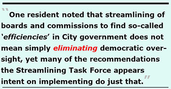 One resident noted that streamlining of boards and commissions to find so-called “efficiencies” in City government does not mean simply eliminating democratic oversight, yet many of the recommendations the Streamlining Task Force appear intent on implementing do just that.