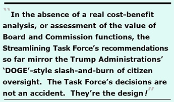 In the absence of a real cost-benefit analysis, or assessment of the value of Board and Commission functions, the Streamlining Task force’s recommendations so far mirror the Trump Administrations’ “DOGE”-style slash-and-burn of citizen oversight. The Task Force’s decisions are not an accident. They’re the design!