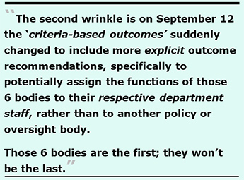 On September 12 that suddenly changed, and for 6 bodies that first box at the top has been expanded to include more explicit outcome recommendations, specifically to potentially assign the functions of those 6 bodies to their respective department staff, rather than to another policy or oversight body. That will drastically reduce citizen involvement, because City staff will be more reluctant to engage with members of the public than their previous oversight bodies did taking public comment during public meetings.