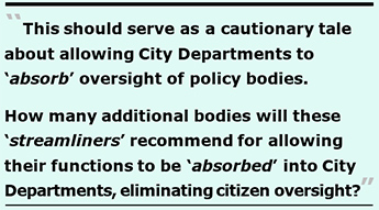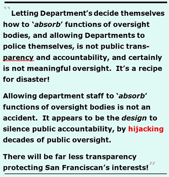 The new 80-page recommendation posted online Friday night proposes handing those 6 bodies functions off to their respective City departments. Letting Department’s decide themselves how to “absorb” functions of oversight bodies, and allowing Departments to police themselves, is not public transparency and accountability, and certainly is not meaningful oversight!