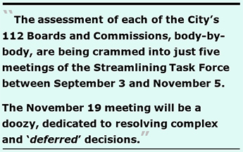 After eight months of developing so-called “templates” and “evaluation criteria” to assess each of the City’s 112 Boards and Commissions, body-by-body actual deliberations are being crammed into just five meetings of the Streamlining Task Force. The first meeting on September 3 considered 10 oversight bodies in the “Public Safety” category. The September 17 meeting will address 20 bodies in the “Infrastructure, Climate, and Mobility” category, while the October 1st Task Force meeting is set for deliberations of 31 bodies in the “Housing and Economic Development” group.