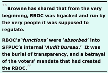 RBOC’s “functions” were shifted — a.k.a, “absorbed” — into SFPUC’s internal “Audit Bureau,” which holds no public meetings. That wasn’t DOGE-style reform, or government efficiency. According to Mr. Browne, it was the burial of transparency, and a betrayal of the voters’ mandate, since 64% of San Francisco voters had passed “Prop. P.” Unfortunately, our current crop sitting on San Francisco’s Board of Supervisors gave the green light to eliminating RBOC (including D-4 Supervisor Joel Engardio, who hopefully will lose his recall election on September 15)!