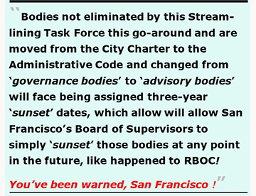 Bodies not eliminated by this Streamlining Task Force this go-around (next January) and are moved from the City Charter to the Administrative Code and changed from “governance bodies” to “advisory bodies” will face being assigned three-year “sunset” dates, which allow San Francisco’s Board of Supervisors to simply “sunset” those bodies at any point in the future, just as the City Supervisors did to the RBOC. You’ve been warned, San Francisco!