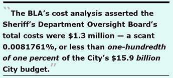 The BLA’s cost analysis was released a day late, and only a day before the Task Force’s September 3 meeting to make initial recommendations on whether to retain, eliminate, or consolidate 10 Public Safety bodies — including the Police and Fire Commissions, and the Sheriff’s Department Oversight Board (SDOB). That left the Task Force with inadequate foreknowledge that the SDOB’s total costs were just $1.3 million — again, a scant 0.0081761%, or less than one-hundredth of one percent of the City’s $15.9 billion City budget for the current fiscal year. The Task Force ran out of time and didn’t evaluate the fate of the SDOB on September 3.