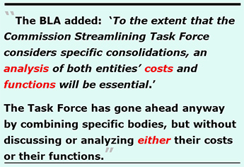 In other words, those key questions haven’t been answered, and it’s completely unclear who will conduct those two analyses, when, and at what additional cost — or if the Commission Streamlining Task Force will just charge ahead and recommend eliminating or combining bodies without a clear answer of how the mandated functions will be carried out, and by whom, and who will perform any additional “essential” specific cost analyses on combining any two specific bodies the BLA recommended be done.