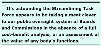 It’s astounding the Streamlining Task Force appears to be taking a meat clever to our public oversight system of Boards and Commissions in the absence of a full cost-benefit analysis. Lacking any assessment of the value of board and commission functions, the Task Force is throwing darts at the wall to see what sticks, and what they can get away with.
