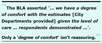 The BLA, sadly, gave too much credit where it wasn’t due about City staff who completed the BLA’s Excel survey workbooks. The BLA asserted “… we have a degree of comfort with the estimates [City Departments provided] given the level of care that many survey respondents demonstrated in preparing their annual financial cost estimates.”