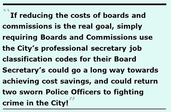 If reducing the costs of boards and commissions is the real goal, simply requiring Boards and Commissions use the City’s professional secretary job classification codes for their Board Secretary’s could go a long way towards achieving cost savings. It could also return two sworn Police Officers to fighting crime in the City!