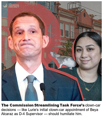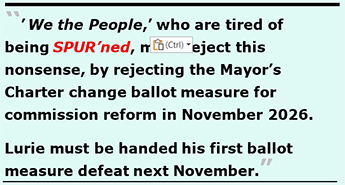 “We the People,” who are tired of being SPUR’ned, must reject this nonsense, by rejecting the Mayor’s Charter change ballot measure for commission reform in November 2026. Just as we voted against “Proposition D” in November 2024, we need to be prepared to reject whatever this “Proposition E” Streamlining Task Force is apparently going to foolishly place on our ballot a year from now in collaboration with the Supervisor Mandelman–Mayor Lurie Task Force! Lurie must be handed his first ballot measure defeat next November.