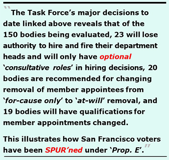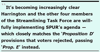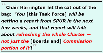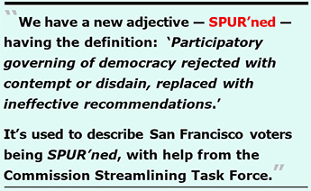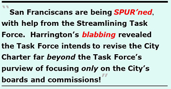 There you have it: San Franciscans are being SPUR’ned, with help from the Streamlining Task Force. Harrington’s blabbing revealed on November 5 that the Streamlining Task Force intends to make recommendations to revise the City Charter beyond the Task Force’s purview of focusing only on the City’s boards and commissions!
