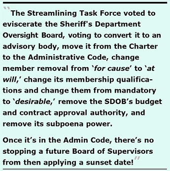 The Budget and Legislative Analyst’s “Financial Analysis Report” of the costs of the City’s Boards and Commissions claims the SDOB costs $1.3 million annually, but its not known how much of the $817,727 in part-time “soft costs” for the SDOB’s commission support is padded by costs associated with the MOU with the Department of Police Accountability, which might vanish if the OIG was fully operational.