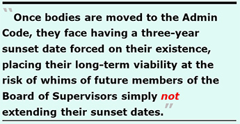 The Task Force’s list of the 150 boards and commissions (formerly the “Commission Workbook”) shows that at the outset of their work, there were 43 boards and commissions in the City Charter, but the current recommendation is to leave just 15 in the Charter, meaning they will have chopped 26 bodies out of City Charter protections. That’s because their initial recommendations had been to move 19 into the Admin Code, but they are still deciding what to do about another 11 bodies, which may happen on December 3. Remarkably, one of the bodies they are still debating is moving the Health Commission — which has oversight of both SFGH and Laguna Honda Hospital — to the Admin Code. They’re also considering moving the Airport Commission to the Admin Code, and potentially the Fire Commission, too.The Task Force made a slew of other decisions on November 19, not described here. They’re available in the meeting minutes, and in the Task Force’s 28-page “Decision Log.”