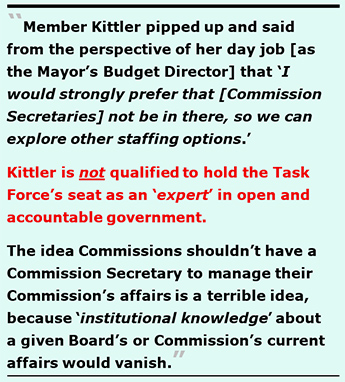 Obviously, focusing primarily on her Mayor’s Budget Director day job of pinching pennies hunting for any potential cost savings, of course Kittler — who is not qualified to hold the Streamlining Task Force’s seat as an “expert” in open and accountable government — wants to eliminate Commission Secretaries that are mandated in the City Charter with managing the affairs of their respective Commissions.
