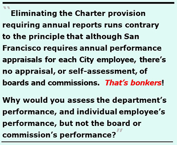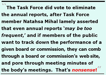 The Task Force did vote to eliminate the annual reports, with Task Force member Natahsa Mihal (the City Controller’s appointee to the Task Force), lamely asserting on November 19 that even annual reports “may be too frequent,” and asserted that if members of the public want to track down the performance of a given board or commission, they can comb through a board or commission’s web site, and pore through the meeting minutes of the body’s meetings. That’s sheer nonsense!