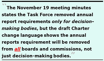 And although the November 19 meeting minutes now available clearly states on page 13 that the Task Force had removed the annual report requirements apparently only for decision-making bodies, the sample draft Charter change language City Attorney Jon Giver is presenting to the Streamlining Task Force on December 3 shows the annual report requirement will be removed from all boards and commissions, not just decision-making bodies.Major Decisions Made and Coming