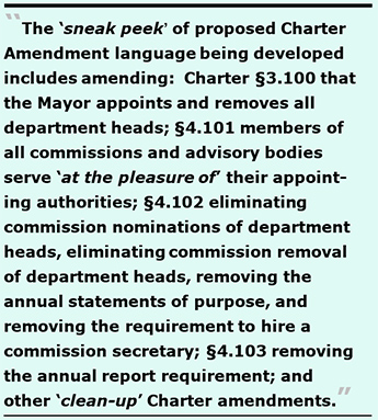 The so-called “sneak peek” of proposed Charter Amendment language being developed by the City Attorney is also on the agenda. The “sneak peek” samples include amending: Charter §3.100 that the Mayor appoints and removes all department heads unless specified elsewhere in the Charter; §4.101 applying the Task Force’s template rule that members of all commissions and advisory bodies serve “at the pleasure of” their appointing authorities, a euphemism for the harsher “at-will” removal; §4.101.5 applying the 60-day holdover limit to all boards and commissions, whether in the Charter or in the Administrative Code; §4.101.6 establishing term lengths and term limits for all Commissioners; §4.102 eliminating commission nominations of department heads, eliminating commission removal of department heads, removing the annual statements of purpose, and removing the requirement to hire a commission secretary; §4.103 removing the annual report requirement; and other “clean-up” Charter amendments.