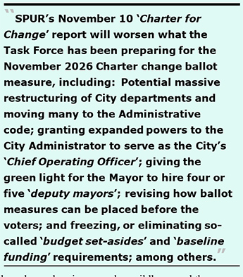 As mentioned above, SPUR’s November 10 “Charter for Change” report will worsen what the Streamlining Task Force has been preparing for the November 2026 Charter change ballot measure — going way beyond just commission reforms.