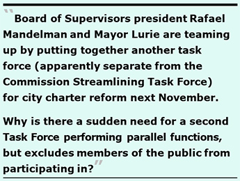 Why is there a sudden need for a second Task Force essentially performing parallel functions, but excludes members of the public from participating in? Shouldn’t a new Task Force be subject to the Brown Act? Why hide behind the secrecy of a “passive meeting body”? Why have Lurie and Mandelman done so?