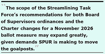 It’s possible that the scope of the Task Force’s recommendations for both potential Board of Supervisors ordinances and the Charter changes for a November 2026 ballot measure may expand greatly, given SPUR’s interventions.