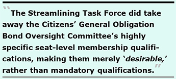 The Streamlining Task Force did take away CGOBOC’s highly specific seat-level membership qualifications, and made them merely “desirable” rather than mandatory and made them “body-level” qualifications rather than for specific seats, and added a four-term limit for three terms (for a maximum of 12 years of member service). Making the qualifications body-level and merely desirable requirements will make it harder for appointing authorities to find candidates to serve on CGOBOC with the requisite knowledge and experience to provide meaningful oversight over hundreds of millions of dollars in general obligation bond spending approved by the voters!
