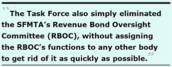 And instead of forcing CGOBOC to take on the duties of the SFMTA RBOC, the Streamlining Task Force simply eliminated the RBOC, without assigning the SFMTA’s RBOC’s functions to any other body, or to SFMTA staff. There goes the oversight of those revenue bonds, as I and other observers (including my Westside Observer colleague, Brian Browne) had been concerned about.