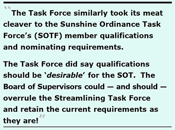 The Streamlining Task Force did say that the qualifications should be desirable for the SOTF. The Board of Supervisors could — and should — overrule the Streamlining Task Force and retain the current requirements as they are!