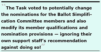 Just as the Streamlining Task Force had been in a tizzy that external organizations were authorized to nominate members to the SOTF, they voted to potentially change the nominations for the Ballot Simplification Committee members and also modify its member qualifications and nomination provisions — ignoring their own staff's recommendation against doing so. As of November 19, the Staff had not yet provided recommendations about those changes, which remain unresolved.